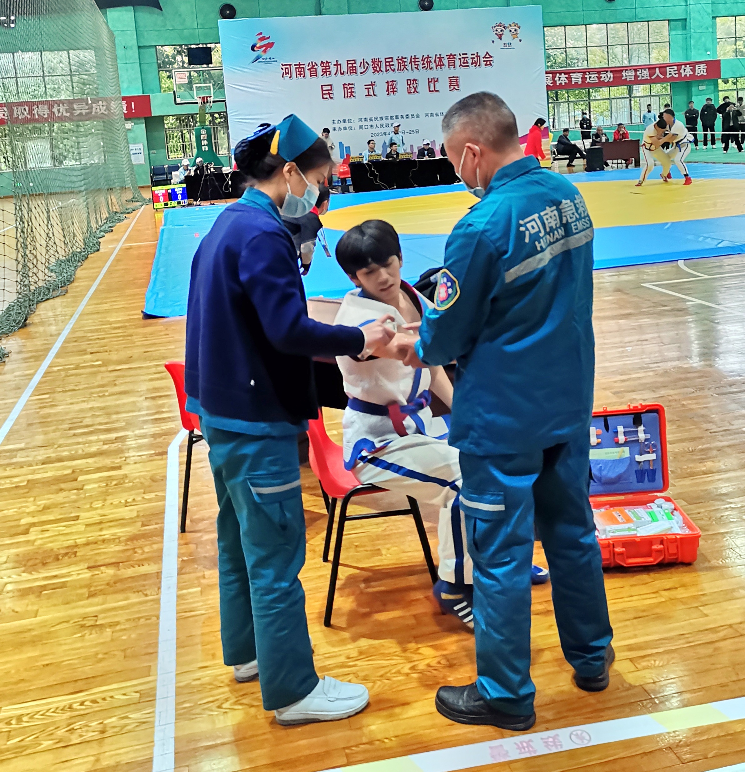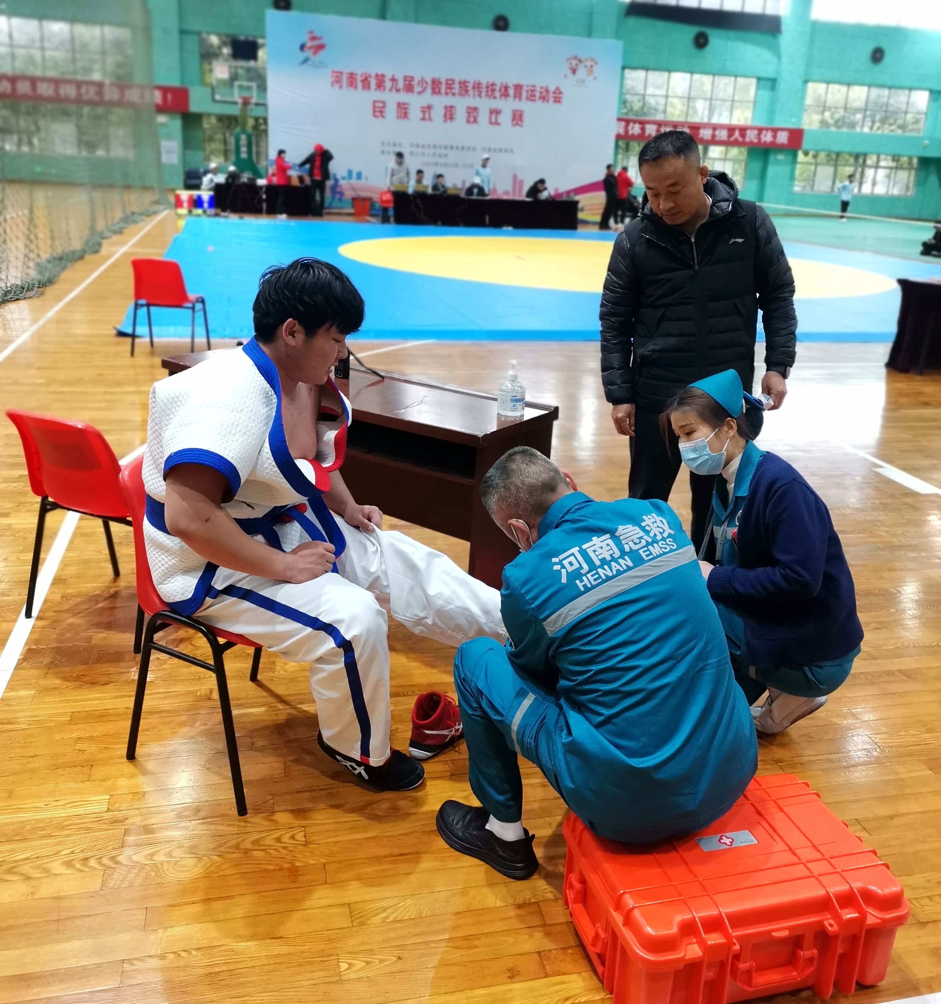 4月22日至26日,河南省第九屆少數(shù)民族傳統(tǒng)體育運動會在周口市舉辦。為確保來賓、運動員、教練員、技術(shù)官員等參會人員的醫(yī)療衛(wèi)生安全,周口市衛(wèi)生健康部門全面調(diào)動全市醫(yī)療資源,建立覆蓋各競賽項目及指定接待賓館的醫(yī)療救治、衛(wèi)生監(jiān)督、防疫消殺等醫(yī)療保健服務(wù)體系,認真完善各項工作方案、預(yù)案,制定細化工作流程,為省運動會提供及時有效、熱情周到的醫(yī)療衛(wèi)生保障服務(wù)。圖為運動員在比賽中受傷,現(xiàn)場保障的醫(yī)護人員迅速處置。