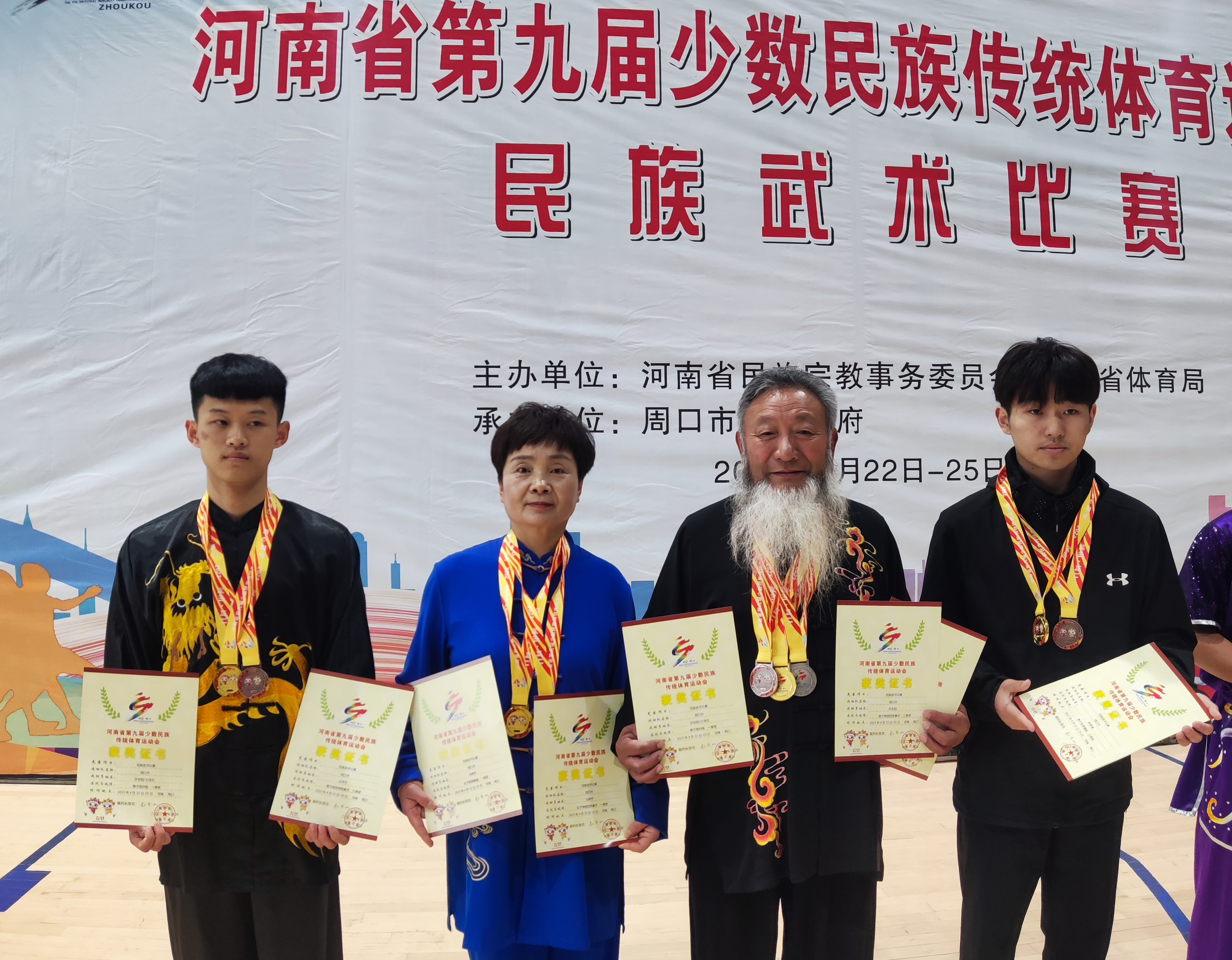 周口隊運(yùn)動員王詩文、馬艷平、許東陽、蘇俊瑞領(lǐng)取獎牌和證書(從左至右)。