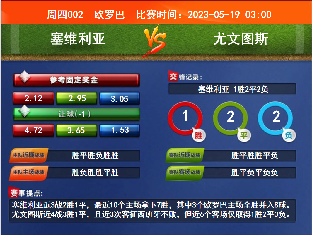 比賽時間:2023-05-19 03:00賽事提點(diǎn):塞維利亞近3戰(zhàn)2勝1平,最近10個主場拿下7勝,其中3個歐羅巴主場全勝并入8球。尤文圖斯近4戰(zhàn)3勝1平,且近3次客征西班牙不敗,但近6個客場僅取得1勝2平3負(fù)。
