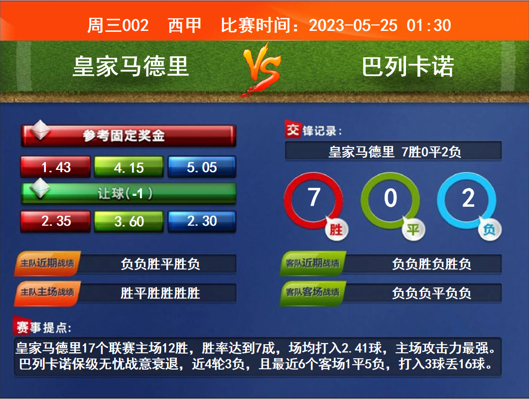 比賽時(shí)間:2023-05-25 01:30 賽事提點(diǎn):皇家馬德里17個(gè)聯(lián)賽主場(chǎng)12勝,勝率達(dá)到7成,場(chǎng)均打入2.41球,主場(chǎng)攻擊力最強(qiáng)。巴列卡諾保級(jí)無(wú)憂(yōu)戰(zhàn)意衰退,近4輪3負(fù),且最近6個(gè)客場(chǎng)1平5負(fù),打入3球丟16球。