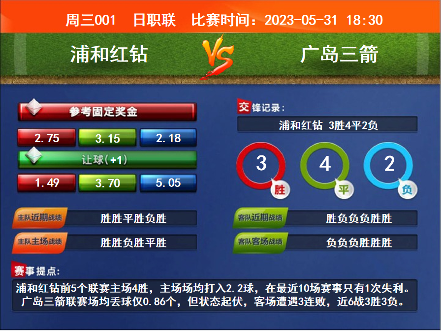 比賽時(shí)間:2023-05-31 18:30賽事提點(diǎn):浦和紅鉆前5個(gè)聯(lián)賽主場(chǎng)4勝,主場(chǎng)場(chǎng)均打入2.2球,在最近10場(chǎng)賽事只有1次失利。廣島三箭聯(lián)賽場(chǎng)均丟球僅0.86個(gè),但狀態(tài)起伏,客場(chǎng)遭遇3連敗,近6戰(zhàn)3勝3負(fù)。