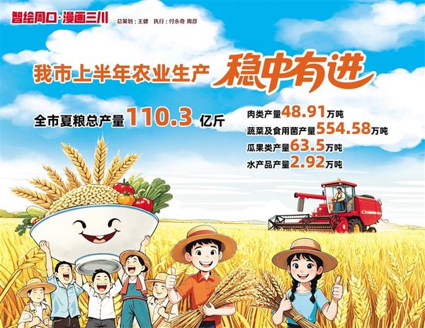 2025年上半年,我市農(nóng)業(yè)生產(chǎn)穩(wěn)中有進(jìn)。全市夏糧總產(chǎn)量110.3 億斤,同比增長0.01%,980.1萬畝秋糧長勢良好,豐收豐產(chǎn)基礎(chǔ)扎實(shí);肉類產(chǎn)量48.91萬噸,同比增長3.19%;蔬菜及食用菌產(chǎn)量554.58萬噸,同比增長3.28%;瓜果類產(chǎn)量63.5萬噸,同比增長3.73%; 水產(chǎn)品產(chǎn)量2.92萬噸,同比增長4.2%。記者 付永奇 周彥 文/圖