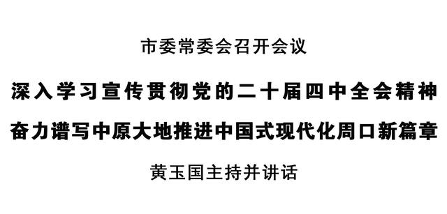 會(huì)議強(qiáng)調(diào),要把學(xué)習(xí)宣傳貫徹黨的二十屆四中全會(huì)精神,作為各級(jí)黨委(黨組)理論學(xué)習(xí)中心組集體學(xué)習(xí)的重要內(nèi)容,納入黨校(行政學(xué)院)教育培訓(xùn)的必修課程,做到黨員干部全覆蓋;各級(jí)宣傳部門要充分利用各種形式和手段,做好權(quán)威解讀和分眾化傳播,讓廣大黨員干部群眾聽得懂、記得住、落實(shí)在行動(dòng)上;要把貫徹落實(shí)全會(huì)精神與習(xí)近平總書記在河南考察時(shí)重要講話精神緊密結(jié)合起來(lái),聚焦“兩高四著力”,錨定“1+2+4+N”目標(biāo)任務(wù)體系,落實(shí)市委“16232”總體工作思路,突出抓好重點(diǎn)項(xiàng)目建設(shè)和招商引資、農(nóng)業(yè)農(nóng)村、城市規(guī)劃建設(shè)管理、文旅發(fā)展、民生實(shí)事、社會(huì)治理等重點(diǎn)工作,全力以赴打贏“十四五”收官戰(zhàn),高質(zhì)量編制“十五五”規(guī)劃,切實(shí)把全會(huì)部署轉(zhuǎn)化為推動(dòng)現(xiàn)代化周口建設(shè)的實(shí)際行動(dòng)。