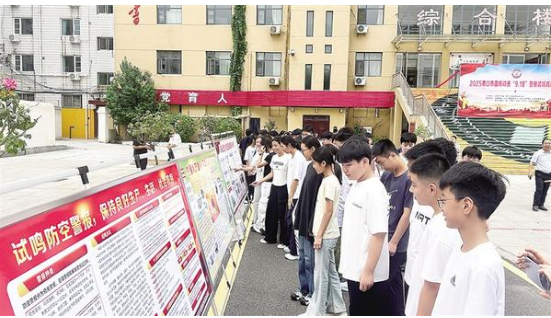 “國防動員九一八警報試鳴疏散演練,現(xiàn)在開始!”9月15日9時30分,周口市第十九初級中學校園內,隨著指揮長的指令下達,“嗚——”的防空警報聲驟然劃破晴空。