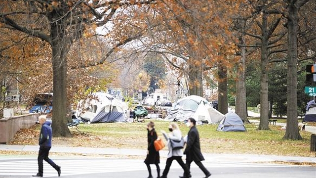 12月8日,在美國(guó)華盛頓,行人經(jīng)過(guò)無(wú)家可歸者居住的帳篷?!?a href="http://www.beihaikh.com/content/2021-12/11/content_962080.html" target="_blank" >[詳細(xì)]