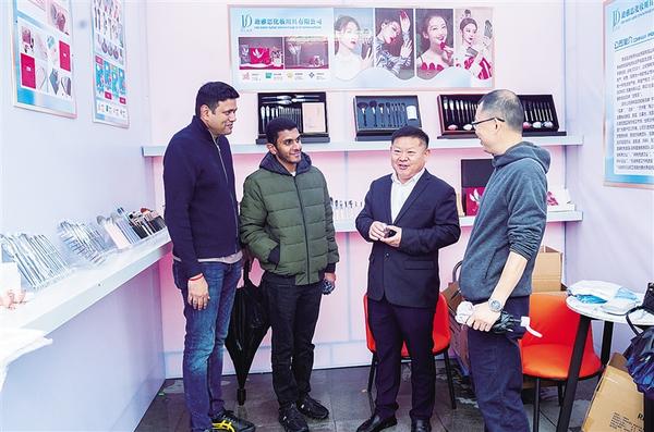 11月16日,鹿邑縣化妝刷企業(yè)的工作人員向兩名外國(guó)客戶(左一、左二)介紹產(chǎn)品。當(dāng)天,鹿邑縣首屆美妝、化妝刷展銷會(huì)在弘道苑廣場(chǎng)開(kāi)幕。本屆展銷會(huì)為期3天,吸引100多家企業(yè)參展。 ...[詳細(xì)]