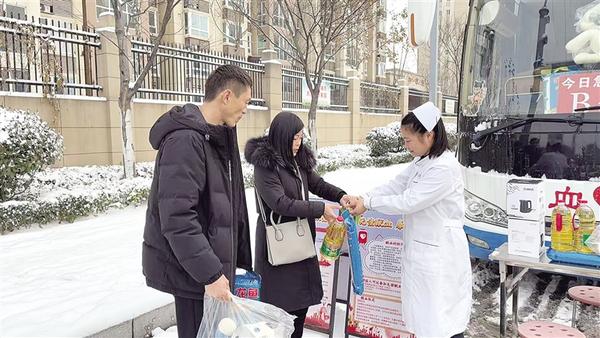 1月19日,熱心市民冒雪步行到獻(xiàn)血車(chē)無(wú)償獻(xiàn)血,以熱血守護(hù)生命。圖為市民獻(xiàn)血后領(lǐng)取無(wú)償獻(xiàn)血紀(jì)念品。