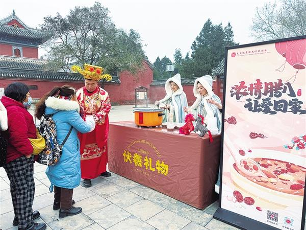 1月26日,游客排隊(duì)領(lǐng)取臘八粥。當(dāng)日,農(nóng)歷臘月初八,一場以“財(cái)神賜?!げ排钪唷す灿槿稹睘橹黝}的活動在太昊陵景區(qū)太極門廣場精彩上演,為游客們帶來了一場沉浸式文化盛宴。