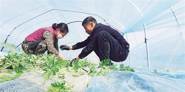 3月15日,在扶溝縣江村鎮(zhèn)江北村現(xiàn)代農(nóng)業(yè)產(chǎn)業(yè)園的大棚里,農(nóng)戶在管理西瓜苗。該園區(qū)占地500余畝,主要種植麒麟美都西瓜、太陽花水果玉米、優(yōu)質(zhì)菠菜,預計每畝年綜合收益1.2萬元,輻射帶動周邊200余名群眾在家門口就業(yè)。