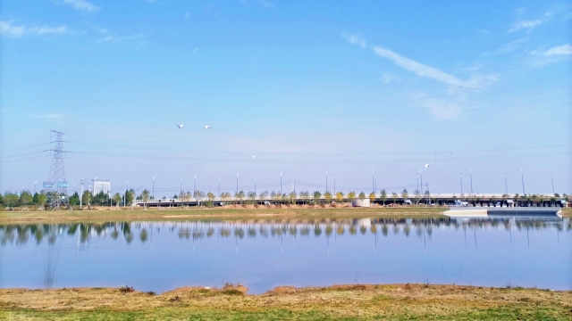 晚秋時節(jié),周口伏羲湖濕地公園風(fēng)景宜人,舉目望去,波光瀲滟的伏羲湖水面上倒映著藍(lán)天、白云、飛鳥,“秋水共長天一色”的絕美畫卷讓人心醉。