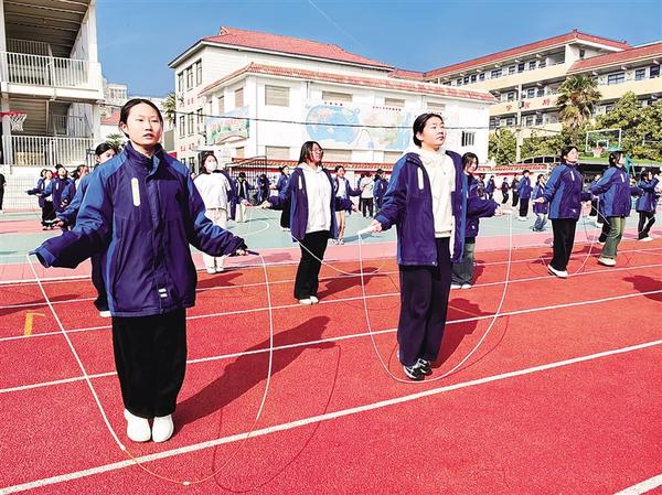 2月26日,周口市第十九初級(jí)中學(xué)九年級(jí)學(xué)生在大課間跳繩。從2025年春季學(xué)期起,我市全面推動(dòng)義務(wù)教育階段學(xué)校每天開(kāi)展兩小時(shí)綜合體育活動(dòng)。