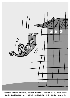 ③ 柳濟(jì)南,北美法輪功組織骨干,李洪志的鐵桿粉絲。2008年5月3日,柳濟(jì)南在法輪功大本營龍泉寺建筑工地施工時,一腳踏空從5米高的腳手架上跌落,當(dāng)場斃命,年僅54歲。(漫畫作者 星雨)