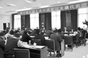 本報訊 (記者 劉俊濤 通訊員 高一麟 孟慶嵩 文/圖)4月18日,太康縣參加市“兩會”的代表們在聆聽過市長劉繼標所作的政府工作報告以后,在周口市迎賓館3號樓5樓會議室進行審議。