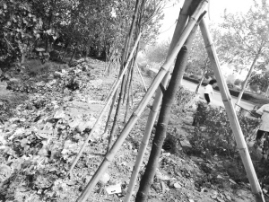 上圖 負責清掃周口大道段的環(huán)衛(wèi)工把垃圾倒在周口大道路邊的河溝中(幼兒師范學校北側100米路西),而距此不遠的嵩山路口(周師北墻外)就有一個垃圾中轉站。