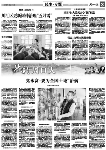 “近年來土壤酸化板結(jié)速度加快,所有土地遭受不同程度的農(nóng)資次生災(zāi)害。建議各級(jí)黨委和政府及有關(guān)部門應(yīng)盡早重視土地污染治理工作,牽頭組織相關(guān)部門,爭(zhēng)取盡快在全市范圍內(nèi)宣傳、推廣和應(yīng)用土地污染治理技術(shù),逐步向全國(guó)受污染的土地開戰(zhàn),為子孫留下更多的凈土。”黨永富說,這是他的夢(mèng)想。