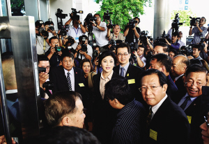 泰國最高法院首次開庭審理英拉“大米案” 5月19日,在泰國曼谷,泰國前總理英拉(中)到達泰國最高法院出席大米收購案聽證會。新華社發(fā)