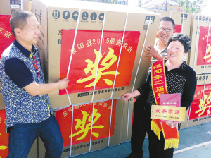 左圖 5月19日,淮陽(yáng)縣隆重表彰63戶(hù)2015年度“最美家庭”。近年來(lái),該縣依托“婦女之家”,通過(guò)召開(kāi)座談會(huì)、講親情故事、曬照片等形式,大力開(kāi)展尋找“最美家庭”活動(dòng),取得了良好的社會(huì)效果。圖為當(dāng)選“最美家庭”的齊國(guó)蘭高興地領(lǐng)取獎(jiǎng)品。