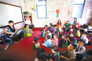 尼泊爾學(xué)校復(fù)課 5月31日,在尼泊爾的巴克塔普爾,復(fù)課的學(xué)生們接受音樂治療。據(jù)尼泊爾當(dāng)?shù)孛襟w報(bào)道,尼泊爾教育部已經(jīng)宣布,全國(guó)14個(gè)地震受災(zāi)縣的學(xué)校將于5月31日復(fù)課。新華社發(fā)