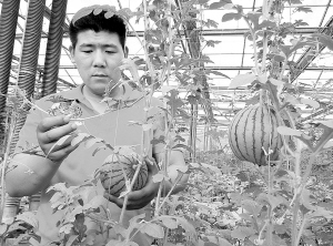扶溝縣豫星農(nóng)業(yè)發(fā)展有限公司種植的“迷你彩虹西瓜”,以個小、皮薄、甜度高暢銷省內(nèi)外,畝均收入達3萬元。圖為員工正在為“彩虹西瓜”整枝打杈。(谷志方 攝)