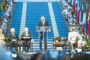 聯(lián)合國舉行《聯(lián)合國憲章》簽署70周年紀(jì)念活動 6月26日,在美國加利福尼亞州舊金山,聯(lián)合國秘書長潘基文在紀(jì)念儀式上講話。紐約聯(lián)合國總部與聯(lián)合國誕生地美國舊金山市26日同時舉行活動,紀(jì)念《聯(lián)合國憲章》簽署70周年。新華社發(fā)