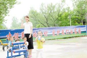 五里廟村村民周振蕾帶著小朋友們?cè)诮∩韽V場(chǎng)上玩耍,臉上充滿(mǎn)喜悅和幸福。