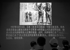 ?。保梗常纺辏保苍拢保慈?,日本《東京日日新聞》記者淺海、鈴木在南京紫金山麓發(fā)出了關(guān)于日軍第16師團富山大隊副官野田毅、炮兵小隊長向井敏明殺人比賽的報道,向井敏明已經(jīng)殺了106人,野田毅已經(jīng)殺了105人,但無法判定誰先殺滿100人,故相約以殺150人為目標,繼續(xù)競賽。