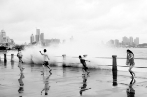 7月12日,人們躲避青島海邊巨浪。 新華社發(fā)