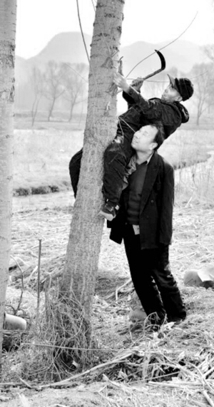 賈文其用肩膀?qū)①Z海霞頂起來(lái),賈海霞用鐮刀將大樹多余的枝杈砍下來(lái)做樹苗。