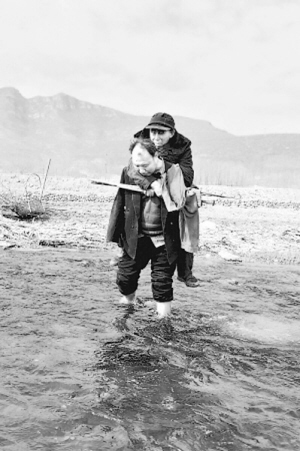賈文其蹚著冰涼的河水,將賈海霞背到植樹地點(diǎn)。